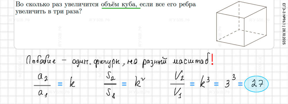 Если фигуры подобны, то площади отличаются в квадрате, а объемы в кубе! |
