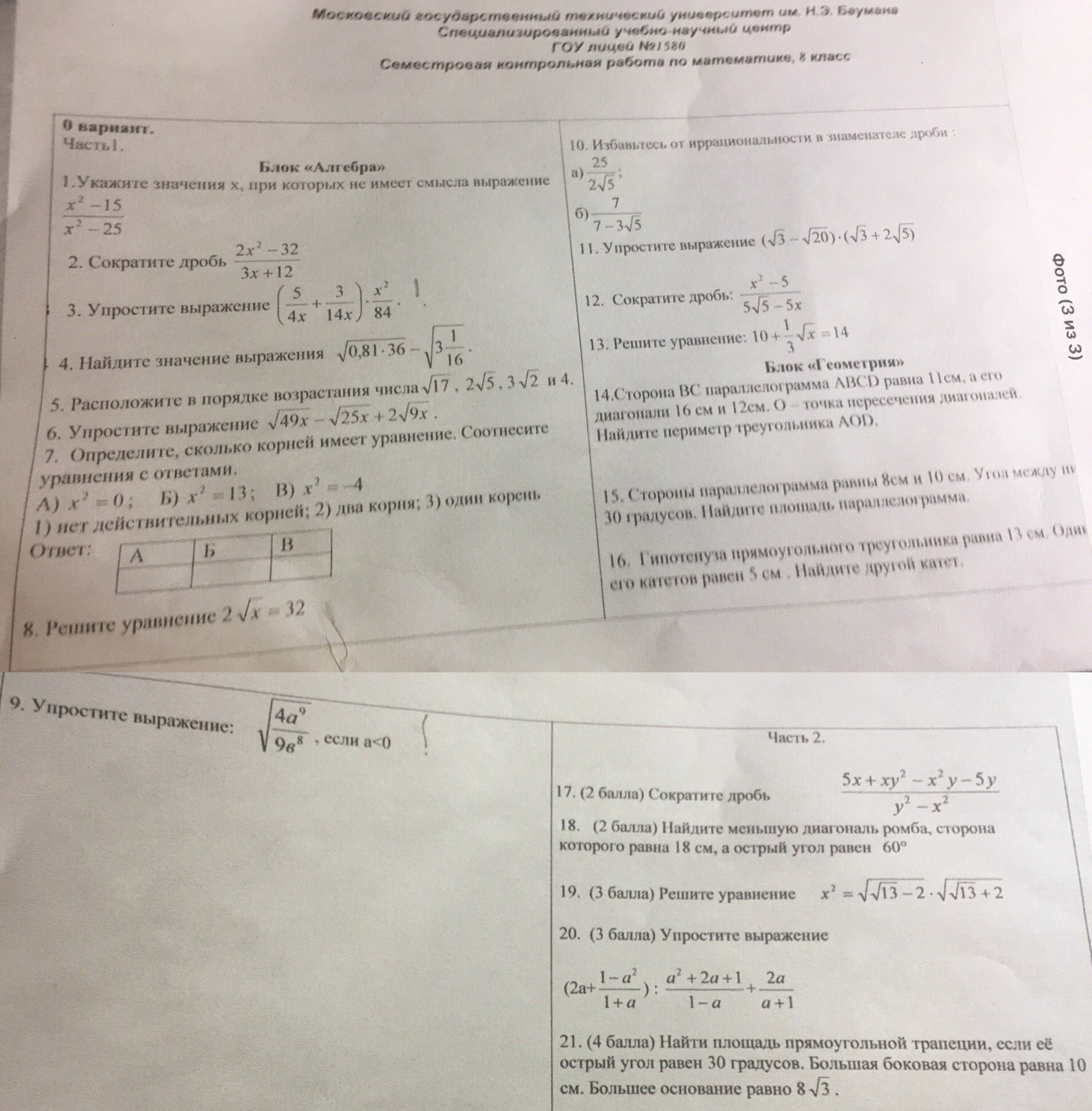 Экзаменационная работа по математике (Основной) для 8-го класса от Лицея №1580 в 2016 году